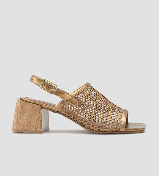 Sandália Festa Tela Bronze com Salto Bloco Amadeirado