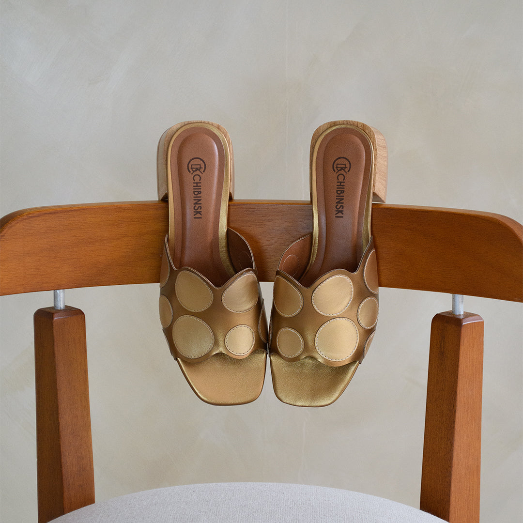 Tamanco Salto Bloco Bronze Detalhes Dourado