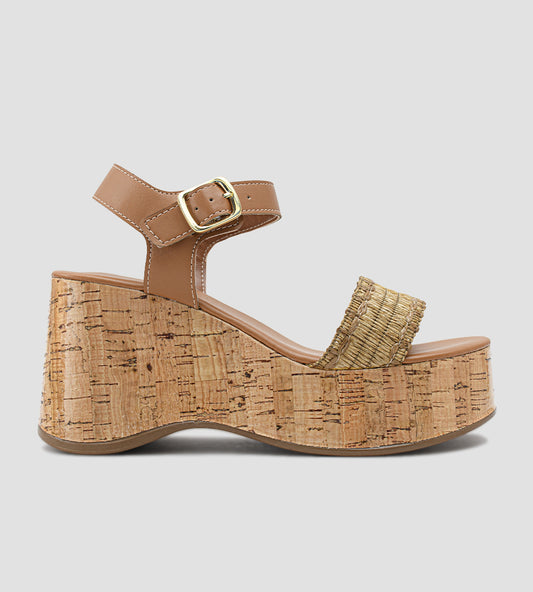 Sandália Anabela com Plataforma em Cortiça e Tiras em Malha Inglesa