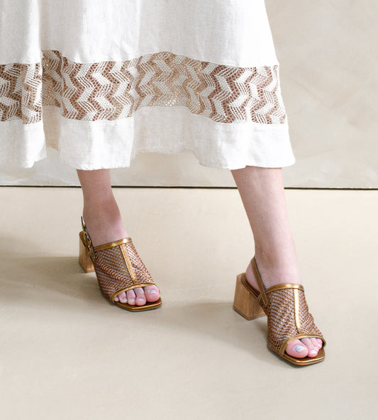 Sandália Festa Tela Bronze com Salto Bloco Amadeirado
