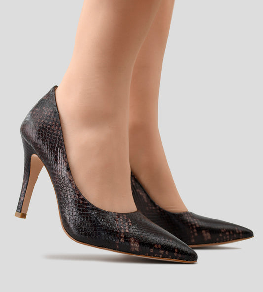 Scarpin Salto Fino Couro Estampa Cobra Marrom