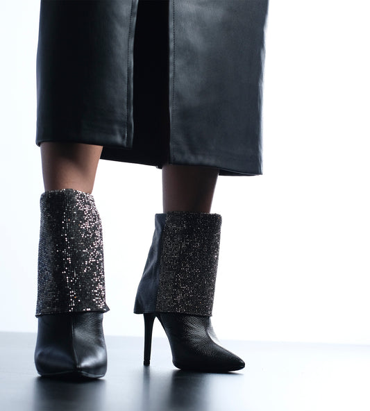 Bota Cano Médio Capa de Sobrepor Malha Strass Couro Preto