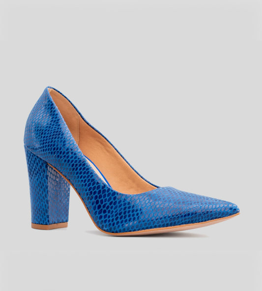 Scarpin Salto Bloco Couro Estampa Cobra Azul